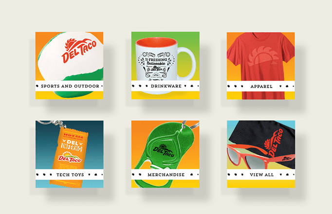 Once completed we proceeded to curate, design, create, manufacture, and deliver dozens of pieces of brand cohesive product. Designing and delivering multiple sku’s per month Del Taco went from having 4 sku’s in market with no specific online presence in early 2016, to having over 100 unique sku’s available seasonally and hundreds of thousand of online visitors per month by the end of the year.